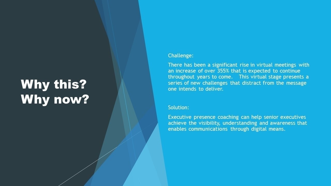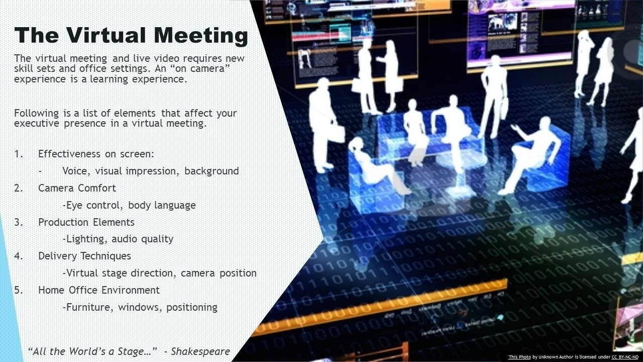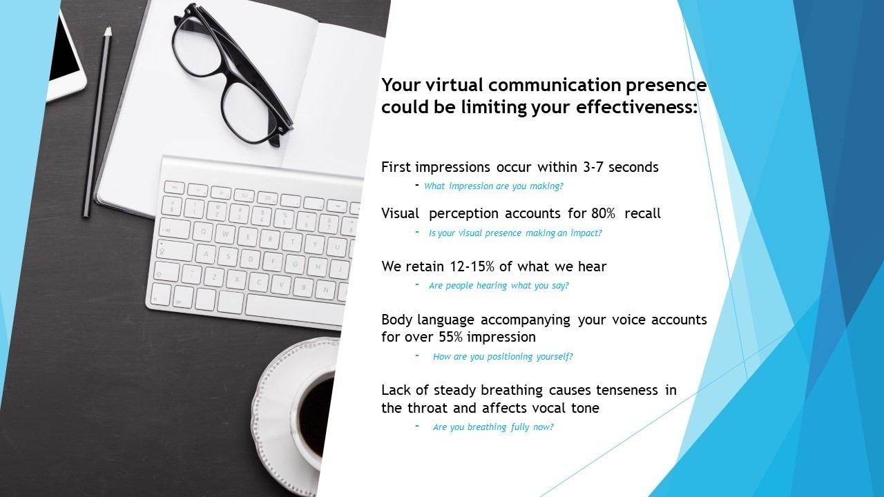 It is time to look in the mirror, or in this case, the screen to enhance your Executive Media Presence. The vital skills needed for effective screen techniques and tools are critical for executives to navigate in this new landscape. Seeing an individual in the dark or looking haphazardly at the screen makes me cringe as our visual sense accounts for the first impression and affects retention.